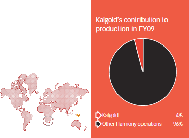 At the end of June 2009, the Kalgold operation reported ore reserves of 0.732 million ounces of gold and mineral resources of 3.910 million ounces. The operation’s expected life-of-mine extends to FY22, whereafter the heap leach material will be processed for a further two years.
