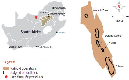 Geology: The Kalgold operation is located within the Kraaipan Greenstone Belt, 60km south of Mafikeng. This is part of the larger Amalia-Kraaipan Greenstone terrain, consisting of north trending linear belts of Archaean meta-volcanic and metasedimentary rocks, separated by granitoid units. Mineralisation occurs in shallow dipping quartz veins, which occur in clusters or swarms, within the steeply dipping magnetitechert banded iron formation. Disseminated sulphide mineralisation, dominated mostly by pyrite, occurs around and between the shallow dipping quartz vein swarms. The D Zone is the largest orebody encountered and has been extensively mined within a single open-pit operation, along a strike length of 1 300m. Mineralisation has also been found in the Mielie Field Zone (adjacent to the D Zone), the A Zone and A Zone West (along strike to the north of the D Zone), and the Watertank and Windmill areas to the north of the A Zone.