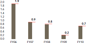 The FIFR increased to 0.2 (FY09: 0), as did the LTIFR year-on-year to 0.7 (FY09: 0.1). Harmony PNG’s AIFR also increased by 15% to 37.4 per million hours worked (FY09: 32.5).