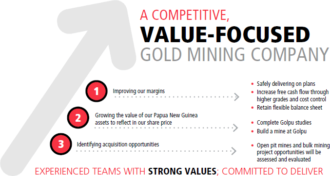 Our aim is to be safe, highly profitable and generate the cash necessary to underpin the development of Golpu, be a sought-after investment, be robust at any gold or copper price, have a diverse risk portfolio (with exposure to South Africa, Papua New Guinea, gold and copper) and to continue growing our quality ounces. Our strategy for 2015 to 2020 is to improve our margins through safely delivering on our plans and increase free cash flow through higher grades and cost control, retain a flexible balance sheet grow our value per share of our Papua New Guinea assets and complete the Golpu studies as it is our intention to build the Golpu mine. We also intend identifying acquisition opportunities of open pit mines and bulk projects.
